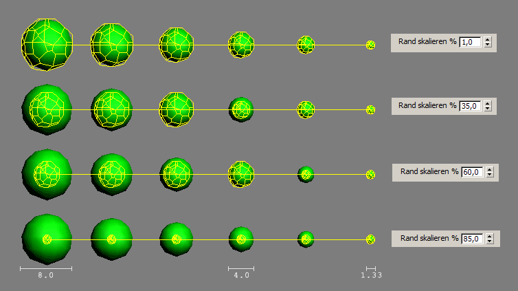 - Zur schnelleren Berechnung der konvexen Hülle für Partikel mit unterschiedlichen Konturen und/oder Größen kann mParticles-Kollisionskontur Partikel mit sehr ähnlichen Skalierungswerten in Gruppen stapelmäßig verarbeiten und die Daten der konvexen Hülle einmal pro Gruppe mit ähnlichem Skalierungswert berechnen. Die Einstellung Rand skalieren legt den Skalierungsunterschied für Partikel fest, die in verschiedenen Gruppen sein müssen.