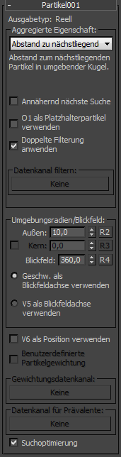 - Bei Aktivierung dieser Option ist die Aggregation schneller, allerdings auch weniger genau. Diese Option ist nur bei Abstand zum nächstliegenden Partikel, Index nächstliegender Partikel und Nächstliegende Partikelposition verfügbar. Aktivieren Sie diese Option, wenn Sie mit sehr großen Mengen von Partikeln arbeiten. Vorgabe = Deaktiviert