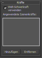 - Listet die in der Szene enthaltenen Kraft-Space-Warps auf, die sich auf dieses Objekt in der Simulation auswirken. Verwenden Sie zum Anwenden eines Space Warps auf das Objekt die Option Hinzufügen. Um zu verhindern, dass ein Space Warp das Objekt beeinflusst, markieren Sie ihn in der Liste, und klicken Sie dann auf Entfernen.