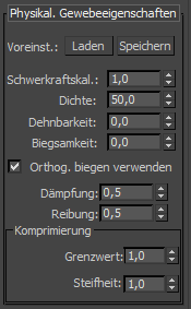 - Öffnet ein kleines Dialogfeld zum Speichern der Einstellungen von physikalischen Gewebeeigenschaften in einer Voreinstellungsdatei. Geben Sie den Namen für die Voreinstellung ein und drücken Sie die Taste
