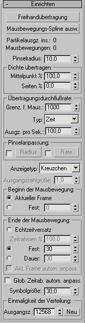 Die Parameter im Rollout "Einrichten" bestimmen die Dichte und die Platzierung der Partikelausgangszahlen sowie den Mausbewegungs-Zeitablauf.