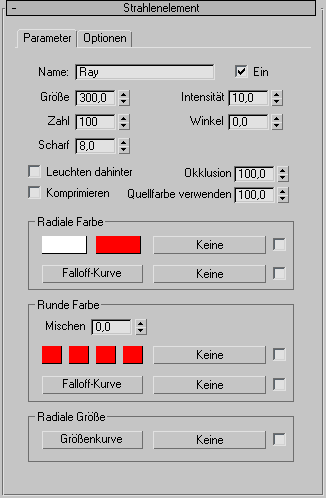 - Gibt den Winkel für die Strahlen an. Sie können sowohl positive als auch negative Werte eingeben, mit denen sich die Strahlen bei der Animation im bzw. gegen den Uhrzeigersinn drehen.