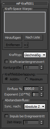 - Um einen in mParticles-Kraft zugeordneten Space Warp auszuwählen, markieren Sie ihn in der Liste, und klicken dann auf diese Schaltfläche. Dadurch wählen Sie den Space Warp in der Szene aus und haben schnellen Zugriff auf die Space Warp-Parameter.