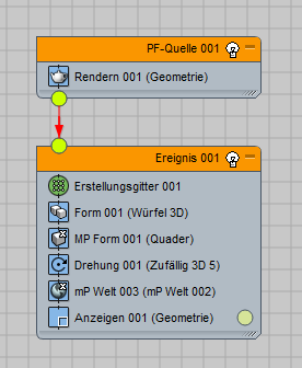 Das lokale Ereignis (Ereignis 001) enthält die folgenden Operatoren: Erstellungsgitter, mParticles-Kollisionskontur, Drehung, mParticles-Welt und Anzeige.