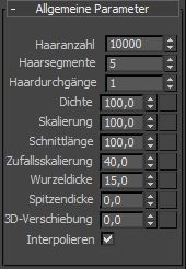 Mit diesem Rollout können Sie viele verschiedene Parameter einstellen, zum Beispiel die Anzahl und Dichte der Haare, die Länge oder die Dicke an Wurzel und Spitze.