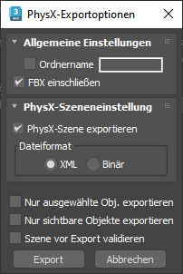 - Speichert die Szene mit dem angegebenen Datentyp im PhysX-Format (siehe unten).