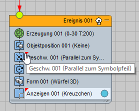 Wenn sich der Mauszeiger über einer Liste befindet und Aktionen kopiert wurden, werden die Aktionen dem Ereignis hinzugefügt. Befindet sich der Mauszeiger über einem leeren Bereich der Ereignisanzeige, wird vom Partikelfluss ein neues Ereignis mit den eingefügten Aktionen erstellt. Ein kopiertes Ereignis kann nur in einen leeren Bereich der Ereignisanzeige eingefügt werden.