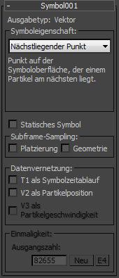 Beim Hinzufügen eines Datensymboloperators oder- test zum Partikelsystem erstellt Partikelfluss ein Symbol und platziert es am Weltursprung. Sie können die physikalischen Eigenschaften des Symbols in der Partikelansicht über das Rollout für den Operator bzw. Test festlegen. Mit dem Symbol-Unteroperator können Sie Berechnungen im Operator/Test basierend auf einer bestimmten Eigenschaft des Symbols ausführen. So können Sie mit dem Symbol-Unteroperator beispielsweise den Abstand zwischen einem Partikel und dem Symbol messen oder einfach die Geschwindigkeit oder die Winkelgeschwindigkeit des Symbols ermitteln.