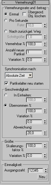 Übergeord. Obj. löschen Wenn diese Option aktiviert ist, wird jedes ursprüngliche Partikel gelöscht, aus dem ein neues Partikel durch Vermehrung entstanden ist. Diese Möglichkeit steht nur zur Verfügung, wenn die Option "Einmal" aktiviert ist.