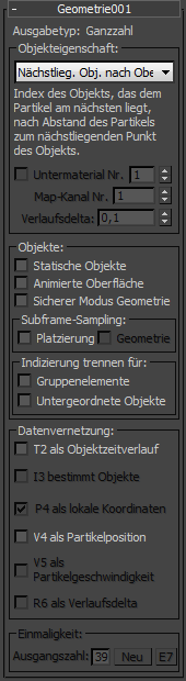 Der Unteroperator Geometrie bietet Zugriff auf geometrische und andere dazugehörige Daten in der 3ds Max -Szene. Der Datentyp der Eingabe ist Objekt; gewöhnlich stammt sie aus der Ausgabe des Unteroperators Objekt auswählen.