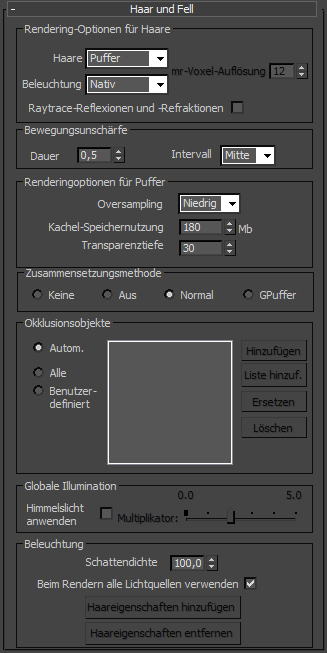 Hier können Sie bestimmen, welche Objekte in der Szene Haar okkludieren, d. h. wenn sich das Objekt näher an der Kamera als ein Teil der Haaranordnung befindet, werden die Haare dahinter nicht gerendert. Vorgabegemäß okkludieren alle Objekte in der Szene dahinterliegendes Haar.