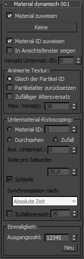 Bei Verwendung animierter Texturen sollten Sie immer die Option "Gleich der Partikel-ID" aktivieren. Ähnliches gilt für zusammengesetzte Materialien, für die Sie stets eine der Optionen unter "Untermaterial-Rotoscoping" aktivieren sollten.