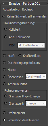 Wählen Sie bei beiden Optionen einen Eintrag aus der Dropdown-Liste, um festzulegen, ob Kollisionen mit Deflektoren oder mit anderen Partikeln berichtet werden sollen.
