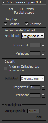 - Der Zeitpunkt, zu dem die Partikel angehalten werden sollen. Das ist der Zeitpunkt, an dem die Partikel vollständig aufhören, sich zu bewegen und/oder zu drehen, und der Test "wahr" ergibt, damit die Partikel dem nächsten Ereignis übergeben werden können. Die Bezeichnung des Parameters hängt von der Zeitablaufauswahl (siehe oben) ab.