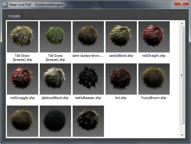 Öffnet das Dialogfeld mit den Voreinstellungen für Haare. Es enthält eine Liste mit Voreinstellungen, die als benannte Musterfelder dargestellt werden. Um eine Voreinstellung zu laden, klicken Sie auf ihr Musterfeld. In 3ds Max sind einige Muster-Voreinstellungen integriert.