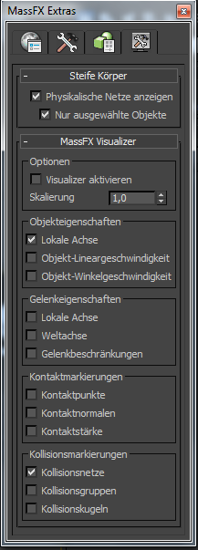 Anmerkung: Wenn Sie den Visualizer (siehe unten) und "Kollisionsnetze" aktivieren, werden für alle steifen Körper in der Simulation, unabhängig vom Status dieser Optionen, physikalische Netze angezeigt.