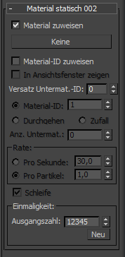 - Material-ID Mit dieser Option wird allen Partikeln dieselbe Material-ID zugewiesen. Der ID-Wert wird über das Zahlenauswahlfeld eingestellt.