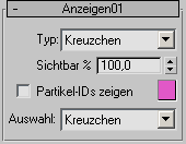 Der Vorgabe-Anzeigemodus ist "Kreuzchen"; dies ist der einfachste Modus, der daher auch am schnellsten angezeigt werden kann. Er eignet sich für Animationen, in denen eine große Anzahl Partikel verwendet wird. Die komplexeste Anzeigeoption ist Geometrie, mit der 3ds Max Partikel in ihrer tatsächlichen Form anzeigen kann. Zusätzlich stehen Ihnen für den Operator "Anzeigen" eine Vielzahl einfacher Formen zur Verfügung, die beim Testen der Animation ein schnelles visuelles Feedback und die einfache Unterscheidung zwischen Partikeln in unterschiedlichen Ereignissen ermöglichen. Außerdem können Sie den Prozentsatz der sichtbaren Partikel einstellen.
