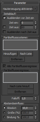 - Wenn Alle Partikelflussereignisse deaktiviert ist, zeigt die Liste die Ereignisse, deren Partikel die Objekterscheinung beeinflussen. Über die Schaltfläche Nach Liste hinzuf. werden Ereignisse zur Liste hinzugefügt. Durch Markieren und nachfolgendes Klicken auf Entfernen werden Ereignisse entfernt.