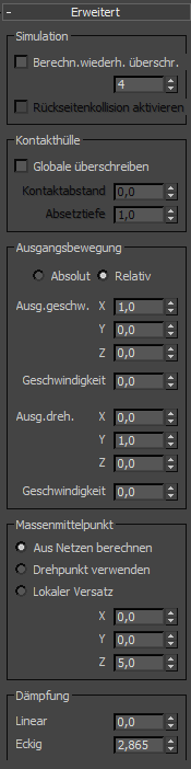 - Diese Einstellung gilt nur für steife Körper, die ursprünglich kinematische Körper waren (diese sind in der Regel bereits animiert) und dann ab dem in der Einstellung "Bis Frame" im Rollout "Steife Körpereigenschaften" festgelegten Frame zu dynamischen Körpern werden. Normalerweise wird die Ausgangsgeschwindigkeit und -drehung solcher Körper anhand der Animation für den letzten Frame berechnet, bevor sie zu dynamischen Körpern werden. Wenn diese Option auf "Absolut" gesetzt wird, werden die Werte für die Ausgangsgeschwindigkeit und -drehung (siehe unten) anstelle der animationsbasierten Werte verwendet. Wenn sie auf "Relativ" eingestellt ist, werden die angegebenen Werte zu den aus der Animation berechneten Werten addiert.