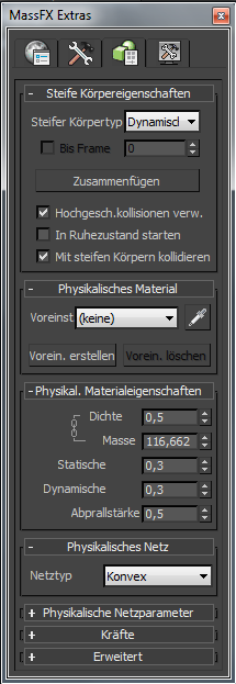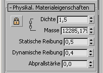 Dieses Rollout enthält grundlegende Hilfsmittel für die Verwendung von physikalischen Materialien, die festlegen, wie steife Körper mit anderen Elementen in der Simulation interagieren. Um bestimmte Werte einzustellen, verwenden Sie das Rollout "Physikalische Materialeigenschaften" (siehe unten).
