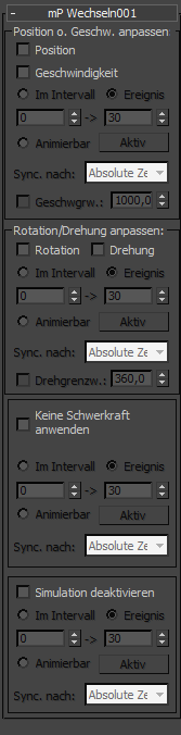 Die zeitliche Einstellung der Option Simulation deaktivieren erfolgt über die Zeitparameter des Bereichs, ähnlich den Zeiteinstellungen im Bereich Position oder Geschwindigkeit anpassen (siehe oben).