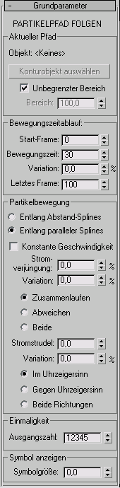 Anmerkung: "Pfad folgen" ist der einzige Kraft-Space Warp, der den Partikelfluss nicht unterstützt. Wenn der Partikelfluss einem bestimmten Pfad folgen soll, verwenden Sie den