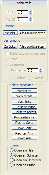 Mithilfe dieser Schaltflächen wird das ausgewählte Teil an die angegebene Position verschoben. Diese Positionen werden von 3ds Max basierend auf den Positionen bestimmt, die Sie mit den Steuerelementen Punkte auf der Figur markieren auf der Objektebene von "Garment Maker" festlegen. Die Positionen sind: