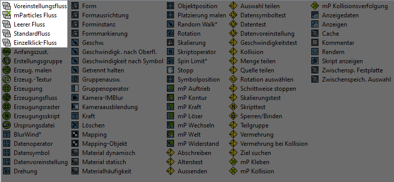 Die Kategorie "Partikelfluss" beinhaltet Verknüpfungen, um verschiedene Arten von anfänglichen Partikelsystemeinrichtungen zu erstellen. Um einen Fluss zu verwenden, ziehen Sie ihn vom Depot in das Hauptfenster "Partikelansicht". Die verfügbaren Flüsse sind am Ende dieses Themas aufgeführt.