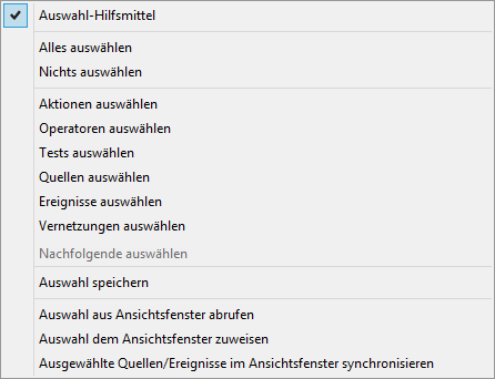 Als Vorgabe ist das Hilfsmittel "Auswählen" aktiv, wenn die Partikelansicht geöffnet ist. Dies können Sie daran erkennen, dass der Mauszeiger die Form eines Pfeils hat. Mit diesem Hilfsmittel können Sie Ereignisse, Aktionen, Hilfsmittel und Vernetzungen markieren, verschieben und kopieren. Sie können die Befehle im Menü "Auswählen" auch dazu verwenden, alle Elemente, keine Elemente oder Elemente nach Kategorie zu markieren.