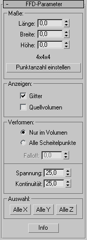 Hier können Sie die Spannung und Kontinuität der Verformungs-Splines anpassen. Obwohl Sie die Splines in einer FFD nicht sehen können, bilden das Gitter und die Steuerpunkte die Struktur zum Steuern der Splines. Beim Einstellen der Steuerpunkte ändern Sie die Splines (die sich durch jeden der Punkte bewegen). Die Splines verformen wiederum die Geometrie des Objekts. Durch Ändern der Spannung und Kontinuität der Splines ändern Sie ihre Wirkung auf das Objekt.