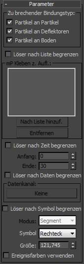 - Wählen Sie die Bindungstypen aus, die Sie entfernen möchten. mParticles-Verbindung kann verschiedene Typen von Bindungen erzeugen, wie im Bereich Bindung einzugehen mit definiert wird. Sie können das Entfernen der Bindungen zwischen Partikeln (Partikel an Partikel), zwischen Partikeln und Deflektoren (Partikel an Deflektoren) und zwischen Partikeln und dem Boden (Partikel an Boden) aktivieren und deaktivieren.