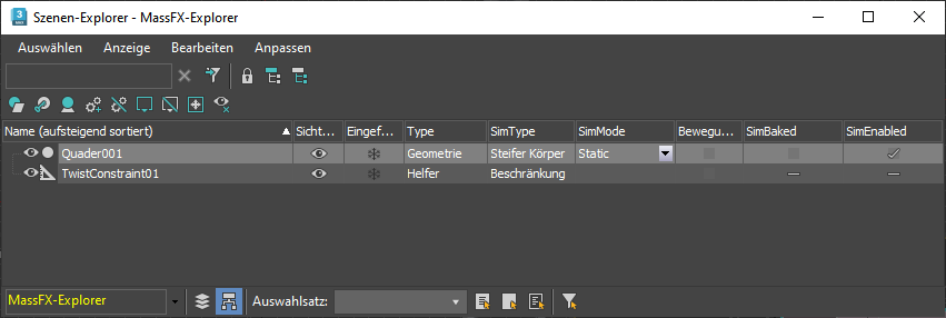 Der MassFX-Explorer ist eine besondere Version des Szenen-Explorers, der speziell für den Einsatz mit MassFX-Simulationen konzipiert wurde. Er ermöglicht Ihnen das Anzeigen der Simulationseigenschaften für alle Objekte in der Simulation und Ändern der Eigenschaften wie des Typs von steifem Körper und der Angabe, ob der Körper Teil der Simulation ist.
