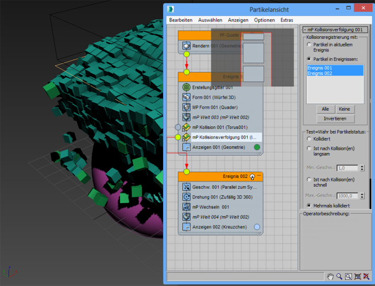 Um die Differenz zwischen den Optionen Kollidiert und Mehrmals kollidiert im Bereich "Test = TRUE If Particle" zu illustrieren, ist ein weiteres Beispiel vorhanden: MassFXInterCollision02.max. Dieses Beispiel enthält zwei Ereignisse und die Partikel werden zum zweiten Ereignis umgeleitet, wenn sie 15-mal miteinander kollidieren, gemäß der Option Anz. Koll. Im nächsten Ereignis sind Partikel statisch: Geschwindigkeit und Drehung sind gleich 0. Die Werte für "Geschwindigkeit" und "Drehung" werden von regulären Partikelfluss-Operatoren festgelegt ("Geschwindigkeit 01" und "Drehung 01"). Um die Partikel jedoch statisch zu machen, wird ein Operator "mParticles-Wechsler" verwendet.