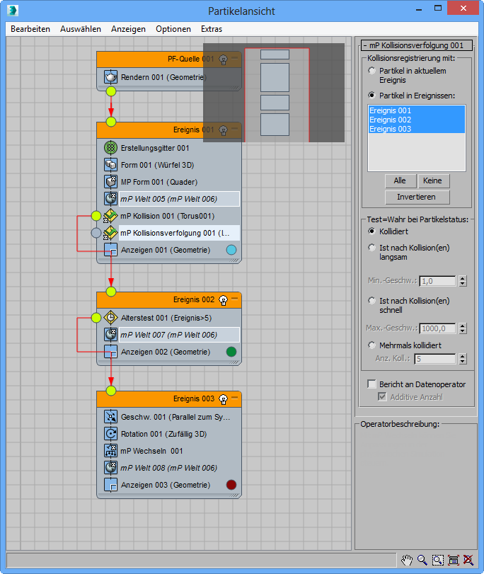 Das Hinzufügen eines mParticles-Kollisionsverfolgungstests zu einem Ereignis entspricht dem Aktivieren der Option "Test = TRUE, wenn Partikel" im mParticles-Kollisionstest: Der Partikelfluss startet das Sammeln von Informationen über Kollisionen. Wie auch der mParticles-Kollisionstest belastet das Erfassen dieser Informationen CPU-Ressourcen. Wenn Sie also Partikel an andere Ereignisse aufgrund der Kollision miteinander nicht unbedingt umleiten müssen, fügen Sie den Test nicht hinzu.