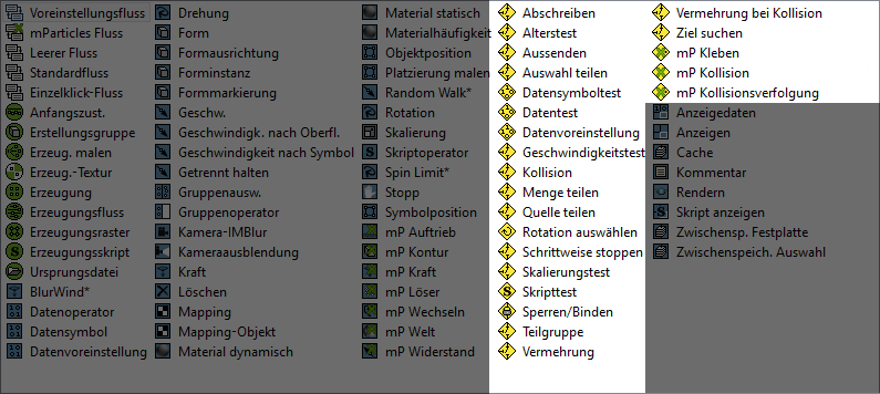 Ein Test, "Vermehrung", führt eigentlich keinen Test durch. Er erstellt einfach neue Partikel aus bereits vorhandenen und setzt die Testergebnisse der neuen Partikel auf "TRUE", damit sie automatisch in ein anderes Ereignis umgeleitet werden können. Beim "Aussenden"-Test werden einfach als Vorgabe alle Partikel an das nächste Ereignis weitergeleitet.