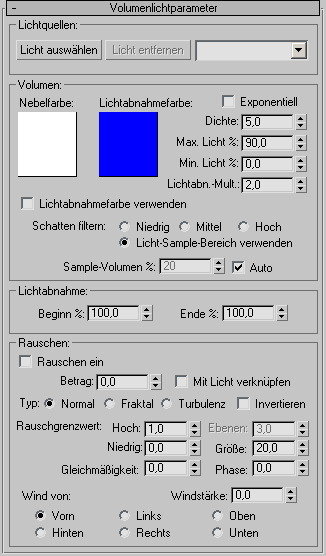 In der Regel soll Rauschen wie Nebel oder Staubteilchen in der Atmosphäre aussehen. In diesem Fall muss das Rauschen bei Lichtbewegungen an die Weltkoordinaten gebunden sein. Für bestimmte Spezialeffekte kann das Rauschen jedoch mit den Lichtkoordinaten verbunden werden. Aktivieren Sie hierfür die Option "Mit Licht verknüpfen".