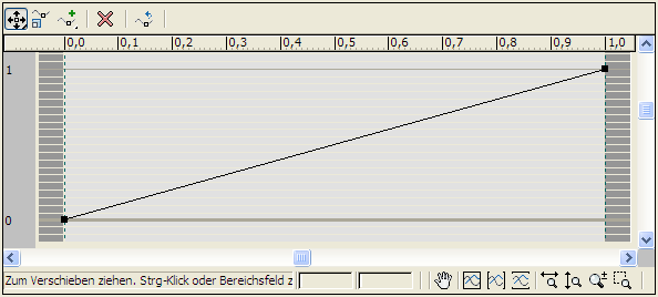 Mit den Steuerelementen im oberen Bereich des Diagramms "Radialer Falloff" können Sie Punkte auf einer Kurve im Diagramm darunter erstellen und verschieben. Die Kurve repräsentiert den Farbenbereich, den Sie im Bereich "Radiale Farbe" ausgewählt haben und auf den aktuellen Lens Effect anwenden. Wenn Sie das Dialogfeld öffnen, sehen Sie eine Linie mit je einem Punkt an den Enden. Diese Linie steht für einen linearen Übergang zwischen zwei Farben. Der Vorgabe-Falloff ist ein Blendübergang zwischen einer Farbe mit dem Wert 1 und einer anderen Farbe, die mit dem Wert 0 endet. Bei diesem Effekt wirkt die erste Farbe intensiver, während die zweite Farbe stark abgeschwächt wird. Entlang der Kurve können Sie weitere Punkte setzen und mit der Maus verschieben. Dadurch verändern Sie die Intensität einer Farbe oder heben sie vollständig auf.