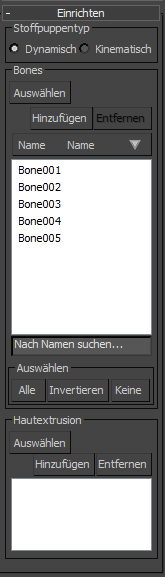 Anmerkung: Wenn Sie die Stoffpuppe erstellen, wird die Liste automatisch mit den Bones gefüllt, die bereits mit der Figur verbunden sind.