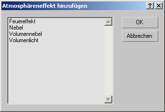 - Öffnet das Dialogfeld "Atmosphäreneffekt hinzufügen" (alle derzeit installierten Atmosphäreneffekte). Wählen Sie einen Effekt aus, und klicken Sie auf "OK", um den Effekt in die Liste aufzunehmen.