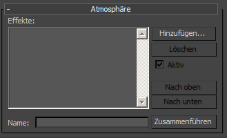- Zeigt die Warteschlange der Effekte, die hinzugefügt wurden. Sie werden in der Szene während des Renderns in linearer Reihenfolge ausgewertet. Je nach gewähltem Effekt wird dem Dialogfeld "Umgebung" das entsprechende Rollout für die Parameter des Effekts hinzugefügt.