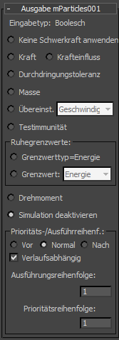 Die Einstellungen Verlaufsabhängig und für die Ausführungsreihenfolge bzw. Prioritätsreihenfolge am Ende des Rollouts Ausgabe-mParticles sind dieselben wie bei einem regulären Unteroperator Ausgabe. Weitere Informationen finden Sie unter Prioritäts- und Ausführungsreihenfolge.