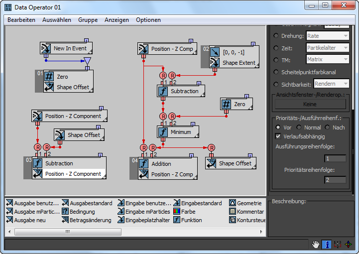 Die Reihenfolge der Datenbearbeitung und -verarbeitung wird durch die Unteroperatoren "Ausgabe" definiert. Die Unteroperatoren "Ausgabe" steuern die Datenbearbeitung. Sie rufen Partikeldaten aus Unteroperatoren höherer Ebenen im Datenfluss ab, und legen die Daten als Partikeleigenschaften ab.