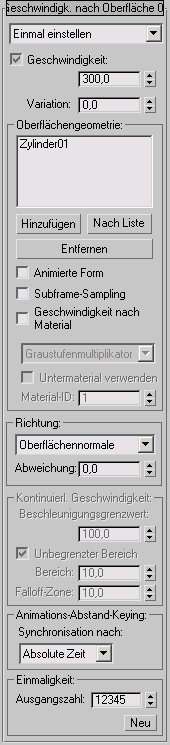 Untermaterial verwenden Wenn diese Option aktiviert ist, wird ein Untermaterial aus dem Multi-/Unterobjekt-Material verwendet, das der Oberflächengeometrie zur Definition der Geschwindigkeit zugewiesen wurde.