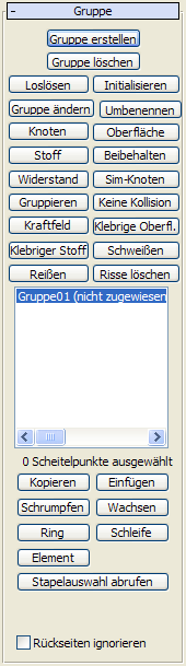 Auf dem Rollout "Gruppieren" können Sie Scheitelpunktgruppen auswählen und sie auf Oberflächen beschränken sowie Kollisionsobjekte und andere Stoffobjekte auswählen.
