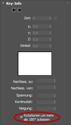 - Blättern Sie zum unteren Ende des Rollouts "Key-Info", und aktivieren Sie die Option "Rotationen um mehr als 180° zulassen". Dadurch können Sie größere Rotations-Keys als 180 Grad festlegen.