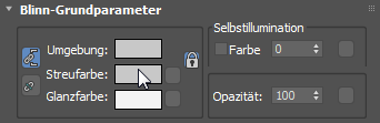 "Blinn", benannt nach James Blinn, dem Pionier im Bereich Computergrafik, ist der vom Standardmaterial vorgabemäßig verwendete Shadertyp. Ein Shader bestimmt, wie das Material mit Licht interagiert. "Streulicht" bezieht sich auf die Farbe des Grundmaterials. Sie finden weitere Informationen über Shader und Materialien in der 3ds Max-Hilfe.