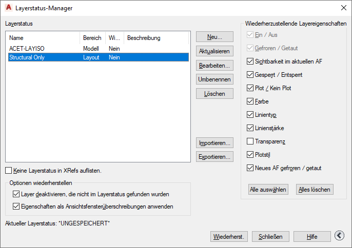 Die Layer-Einstellungen umfassen den Layerstatus (Ein oder Gesperrt) und Layer-Eigenschaften wie Farbe oder Linientyp. Bei einem gespeicherten Layerstatus können Sie entscheiden, welche Layerstatus und Layer-Eigenschaften Sie später wiederherstellen möchten. So können Sie z. B. nur die Einstellung Gefroren/Getaut der Layer in einer Zeichnung wiederherstellen und alle anderen Einstellungen ignorieren. Beim Wiederherstellen dieses benannten Layerstatus werden alle aktuellen Einstellungen beibehalten, mit Ausnahme der Einstellung Gefroren/Getaut der einzelnen Layer.