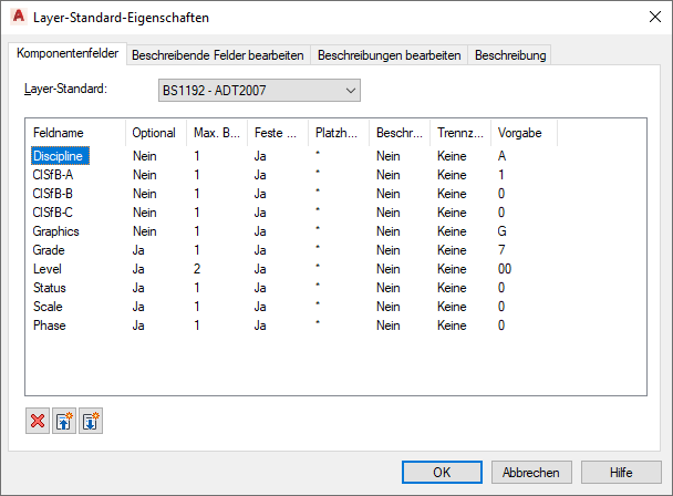 Layer-Standards bestimmen die Namenskonventionen für Layer in Ihren Zeichnungen. Ein Layer-Standard enthält einen Satz von Regeln, der die Struktur von Layer-Namen in einer Zeichnung festlegt. So können Sie bereits beim Installieren der Software einen bestimmten Layer-Standard aus einer Reihe gebrauchsfertiger Standards auswählen. Dabei können Sie jeden Layer-Standard auch zu einem späteren Zeitpunkt nach Bedarf ändern oder bearbeiten.