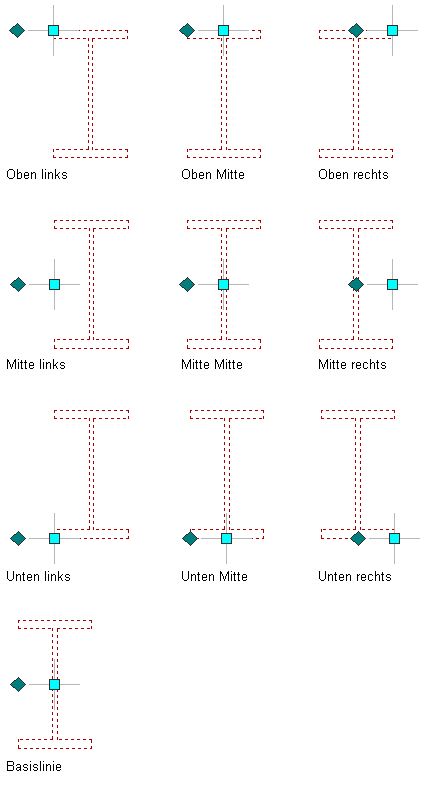 | Positionieren der Unterzugachse entlang einer von neun Positionen auf der Unterzugform | Wählen Sie eine der neun Positionen für Ausrichten. Anmerkung: Diese Positionen sind bei einer Drehung von Null festgelegt, wenn der Unterzug von hinten betrachtet wird.